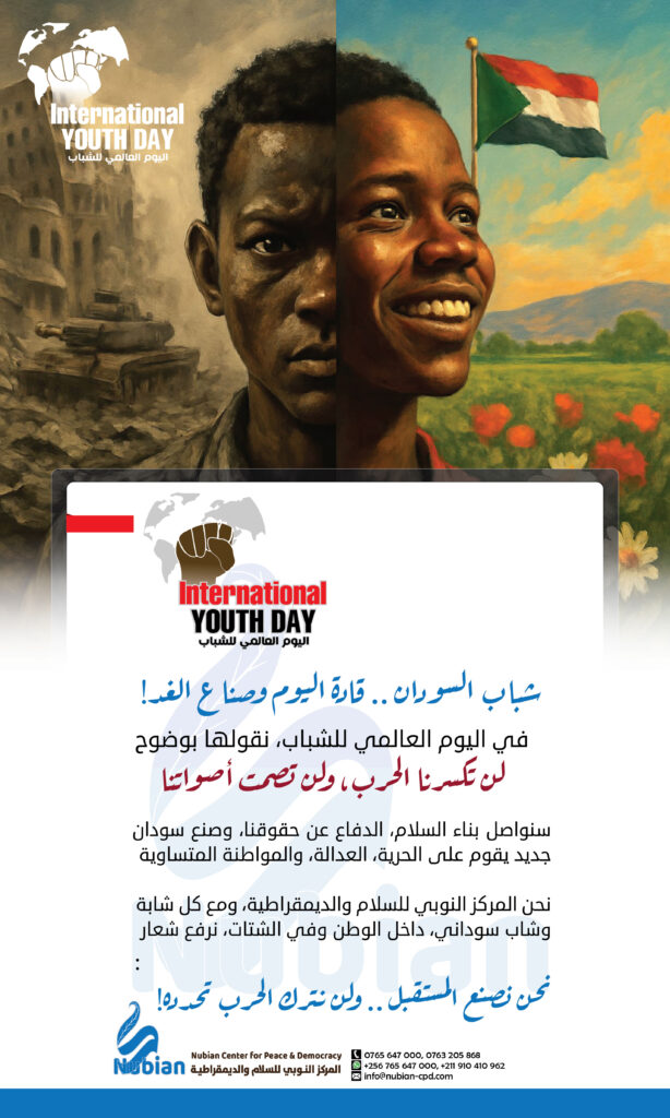 المركز النوبي للسلام والديمقراطية  بيان في اليوم العالمي للشباب شباب السودان .. قادة اليوم وصناع الغد في هذا اليوم العالمي للشباب، يواجه شباب السودان واحدة من أكثر اللحظات تحدياً في تاريخهم المعاصر. فبينما يحتفل العالم بطاقة الأجيال الجديدة، يعيش ملايين الشابات والشبان السودانيين واقع الحرب، والنزوح، وفقدان الأمان، وانهيار المؤسسات التي كانت تحمي حقهم في